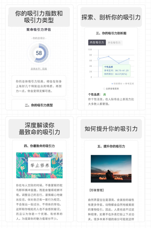 为此,壹心理专业测评团队共同研发「致命吸引力」测试,将从外在吸引力和内在吸引力两大部分,异性缘、人际魅力、个性品质、形象管理等7个方面,探索你身上致命的吸引力。同时根据你的不足,提供建议,助你成为更加自信出彩的自己。