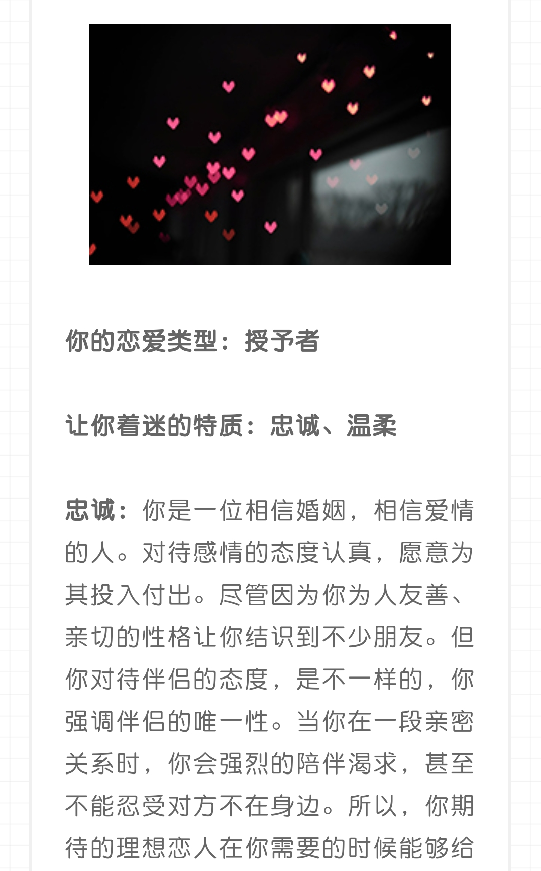 为此,壹心理专业测评研发团队共同研发「理想恋人测试」,将: