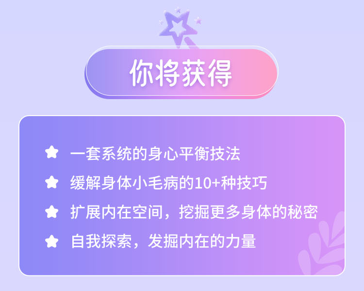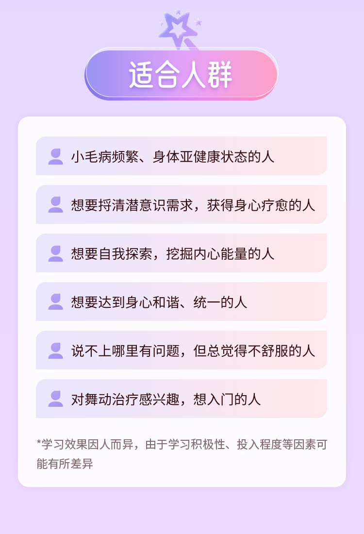 0基础舞动治疗课,不仅基于舞动理论,还创造性地结合了身心平衡理论的基础,旨在帮助你解决即刻的身体问题,再在舞动的带领下走进内心疗愈情感创伤。
