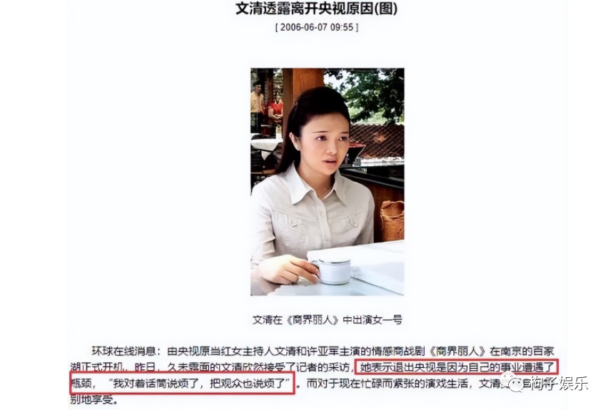 文清听到之后,也是无奈出面澄清这个事情,她解释自己只是觉得自己的事业遇到了瓶颈,高不成低不就。