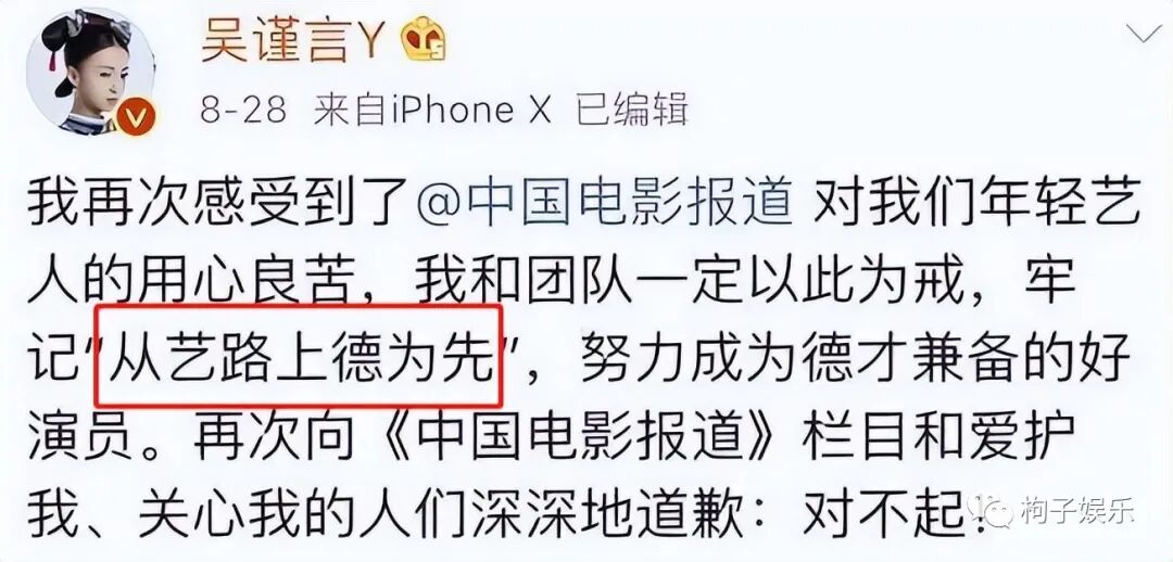 面对央视的严刑拷打,吴谨言终于发出了向六公主道歉的声明,并表示自己会牢记“从艺路上德为先”。