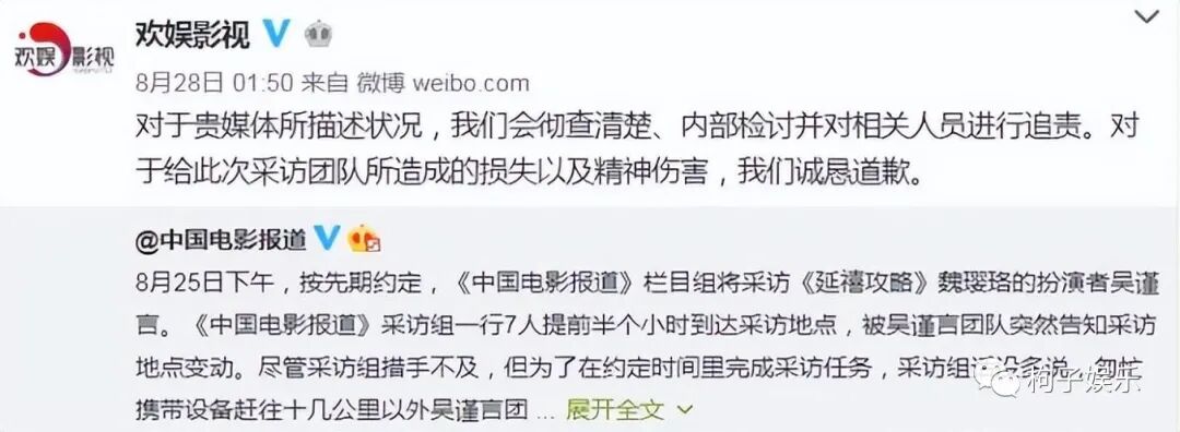 这个声明发出后,她的经纪公司欢娱影视第一个站出来回应并道歉,