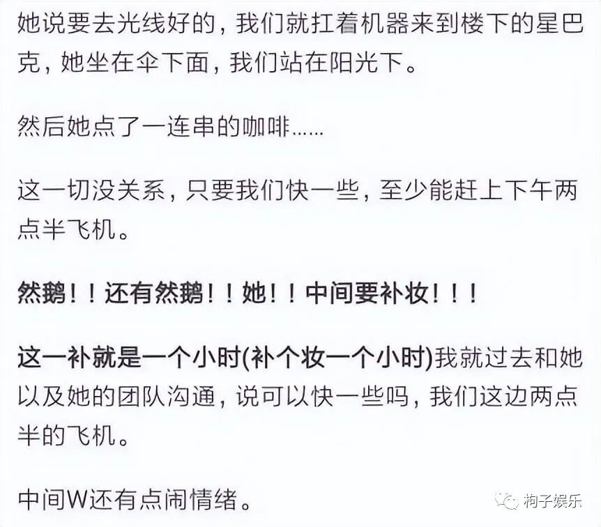节目组顶着十点的大太阳开始搭建设备,她则坐在太阳伞下喝了一个多小时的咖啡,当节目组布置完成后,吴谨言却说:“等我一下,我还要补个妆。”
