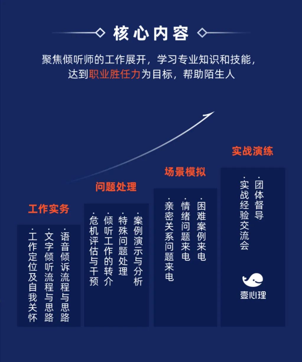 二阶课程以聚焦倾听师的工作展开,学习专业知识和技能达到职业胜任力为目标,帮助陌生人。