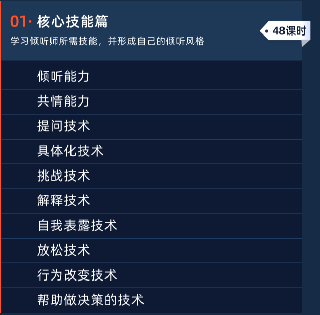 首先,你会学习倾听师所需技能,习得涵盖关系建立、问题聚焦和行动策略三大模块的核心能力。