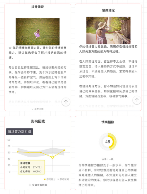 ※本测评可以通过情绪觉察、情绪管理、情绪驱动、情绪理解和社交技巧五个方面来综合评估你的情绪智力指数,并根据你的具体情况提供有针对性的指导和建议,帮助你更好地认识自己、建立和谐融洽的人际关系。