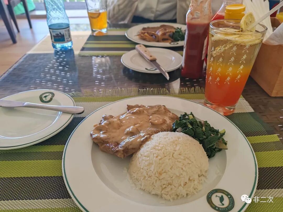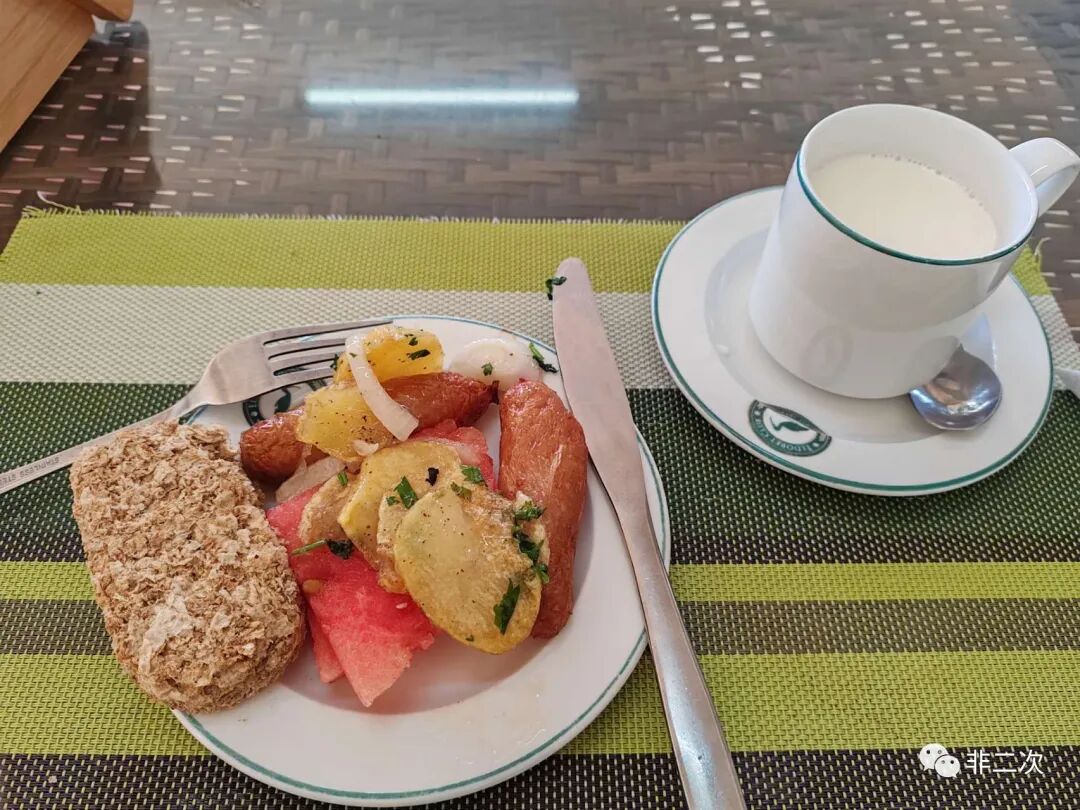 清晨,工作人员早早就会开始清理草坪,开着割草机的工人在高尔夫球场上穿梭,餐厅的服务员也会早早开始准备大家的早餐。这里的早餐是自助餐,提供免费的牛奶、奶茶、芒果汁等饮料。
