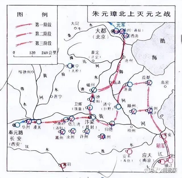 第一步,明军利用舰船优势,先由江入淮,溯运河而上。此时元朝强兵多在西部,明军目标应该就是大都了。