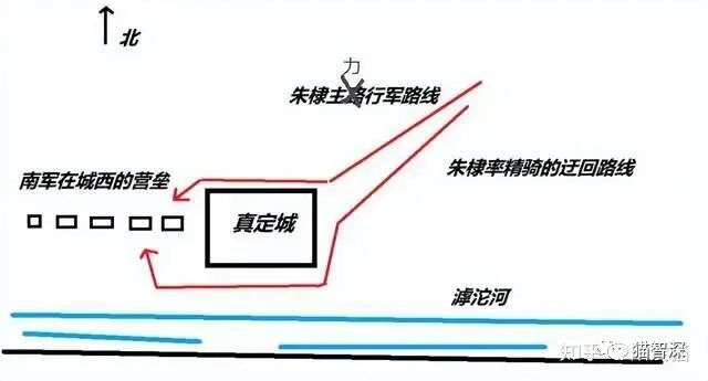 朱棣数万大军奔真定而来。半路上,他让大军按原速度继续前进,自己则带少数精锐骑兵告诉迂回到真定东边,在其后方袭击了一伙运粮队。