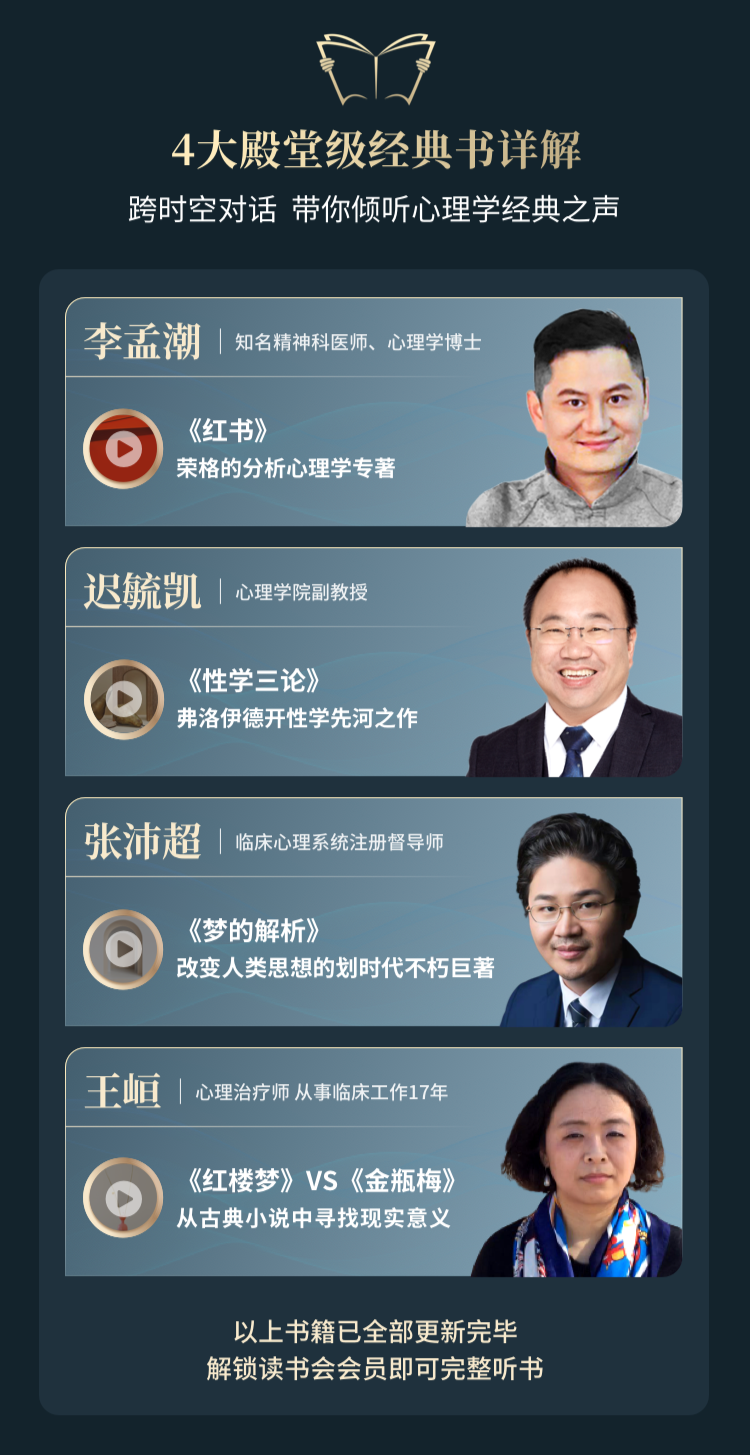 还邀请了12位大咖咨询师,每月开1次120分钟的直播课,深度解读这些经典好书,带你用心理学知己识人,看懂世界,解决人生各种困扰。