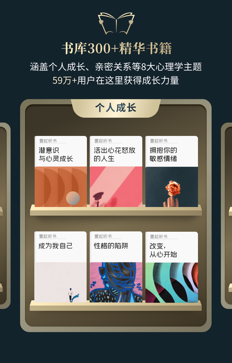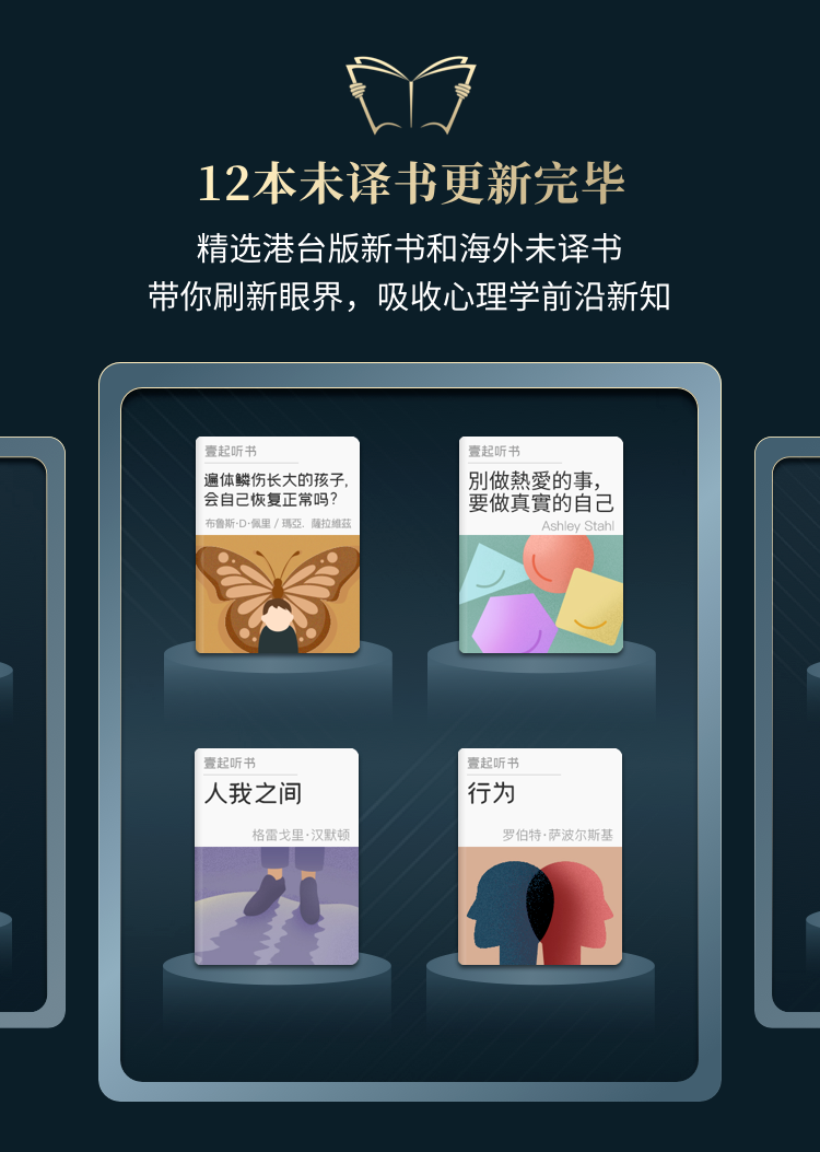 书库收藏了近几年广受欢迎且实用的300多本心理学好书,豆瓣平均评分8分以上,加入即可全部免费畅听,相当于“送”你一个心理类图书馆。