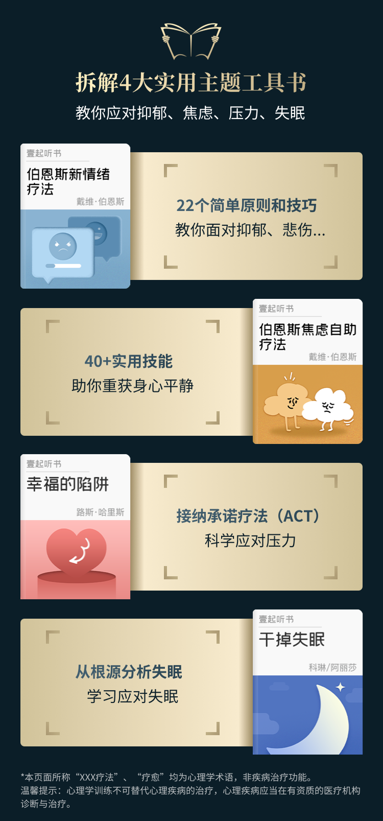 不用担心工具书晦涩难懂,枯燥读不进。我们将书本内容进行拆解,总结提炼出实用部分及心理学自助技巧,教你应对抑郁、焦虑、压力、失眠。