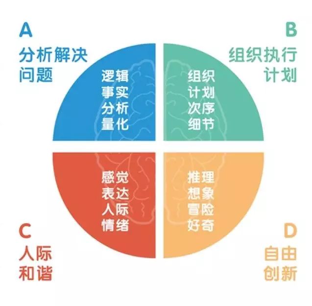 心理学家说:“人类的思维偏好在大脑中可以划分为A、B、C、D四个象限,各自掌管不同的能力——分析解决问题、组织执行计划、人际和谐和自由创新。