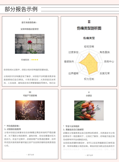 从轻视忽略、过度掌控、情感缺失、边界模糊等8个维度分析你原生家庭的教养方式和存在的伤痛,评估原生家庭对你的个人成长方面可能带来的影响,并根据对你的结果,为你提供一些可操作的建议,帮助你消除伤痛,更好的治愈自己的内心。