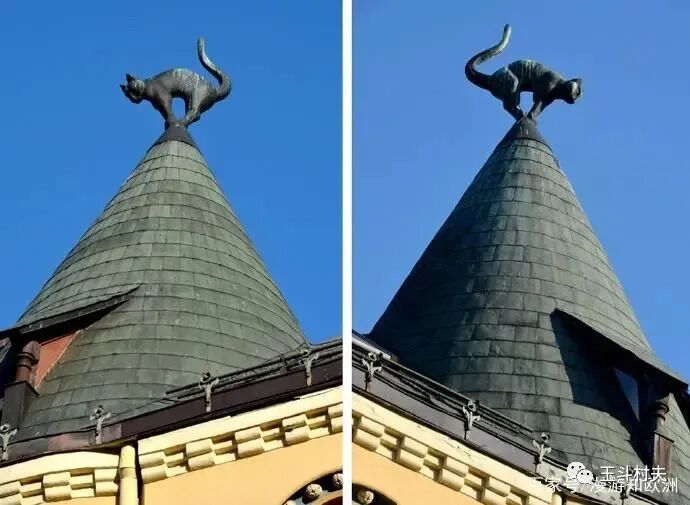 但是,老城倒有一座有名的猫屋给人留下深刻的印象:这个建筑物尖顶的标志是一只黑色的猫,这里有一段有趣的故事。猫屋的对面是商业行会,猫屋主人曾经是商业行会的成员,后因故被行会开除。他就在行会的对面盖了这座楼,在楼顶设计了一只猫的标志,那猫的尾巴高高翘起,露出屁股朝向行会,以此侮辱对方。在行会的抗议下,法院介入调解。最终行会和猫屋的主人达成协议,保留这座建筑,但改变了猫屁股的朝向,将猫头朝向行会。然而时过境不迁,当年猫屋的主人和行会早已消亡,但猫屋主人和行会间争执的故事及其独具匠心的建筑却作为当地的历史文化流传下来。这是不是也给人以启示:人生短暂、世事无常,快乐最重要,凡事不必较真。