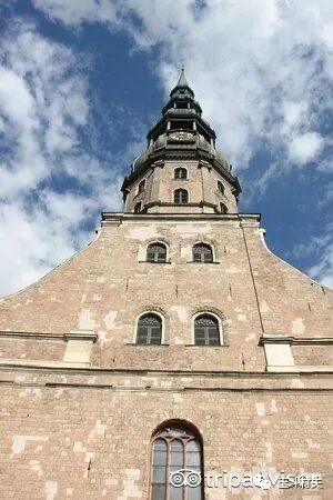 我们从里加老城市政广场开始游览。这里最引人注目的建筑是里加圣彼得大教堂。大教堂建于13世纪,曾经是当时世界上最高的木质教堂钟楼,先后两次毁于大火和地震。1973年重建时改为金属结构,高123.25米,是里加城市的标志。也许是年久失修吧,教堂显得有些破旧,外墙斑驳脱落,给人一种沧桑的感觉。在教堂顶端上有一个生铁铸成的公鸡,鸡身一面为金色,一面为黑色。这只公鸡也叫风信鸡,有着辨别风向的作用,当金色一面对着城市时表示顺风,海上的船只可以进港;当黑色一面对着城市时,表示逆风,船只不能进港。在当地,公鸡又被认为是能驱鬼辟邪的吉祥物,因为鸡叫三遍,天就亮了,魔鬼就要返回地狱。所以当地的建筑物顶上一般都塑有一只公鸡。