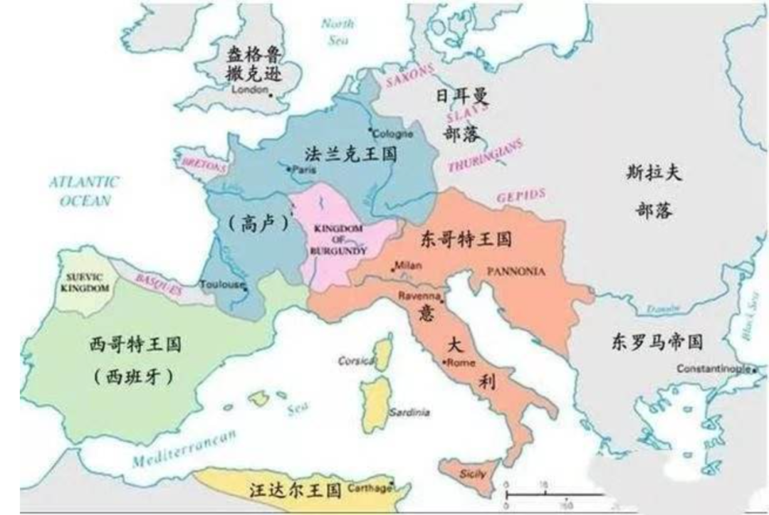 此外还有其他日耳曼人分支纷纷趁着罗马帝国崩溃之际建立国家,比如勃艮第人在高卢建立的勃艮第王国,法兰克人建立的法兰克王国,东哥特人在意大利北部建立国家,伦巴底人建立伦巴底王国,还有不列颠地区,有盎格鲁人、萨克逊人、朱特人建立的7个小王国。