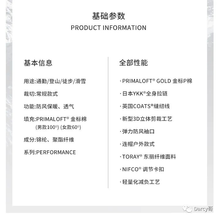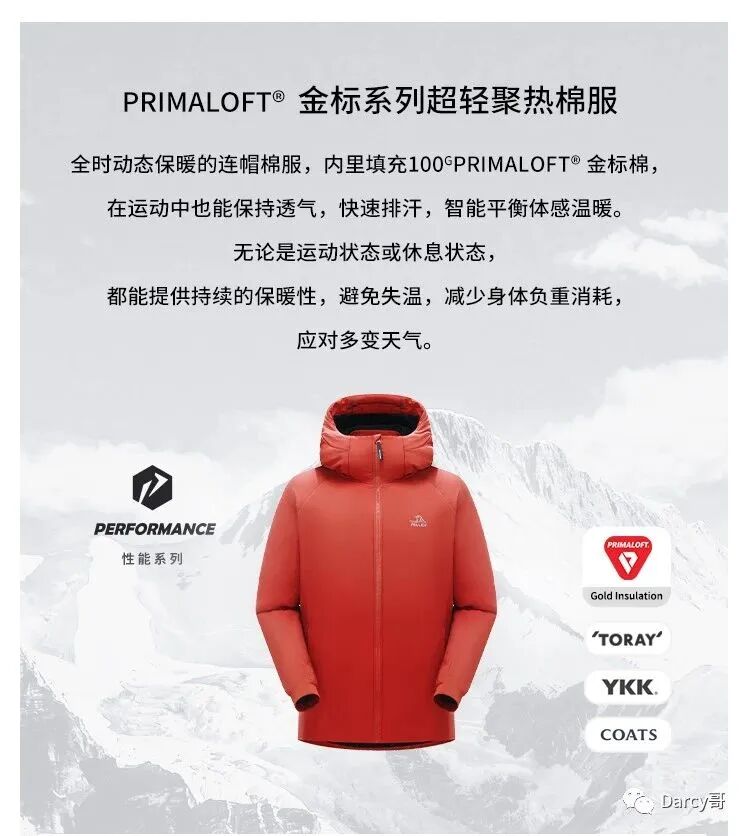 拓路者和伯希和从eVent专业冲锋衣的竞争,在另外一个热门的户外服装棉服身上也得到了体现。两者都推出了采用顶级棉服材料Primaloft金标P棉的棉服产品,并不约而同都采用了知名的“TORAY”东丽20D尼龙面料。