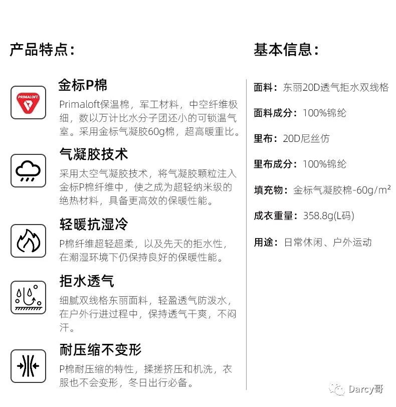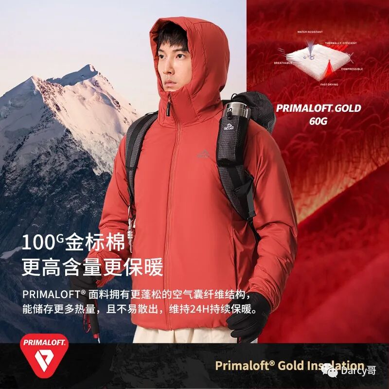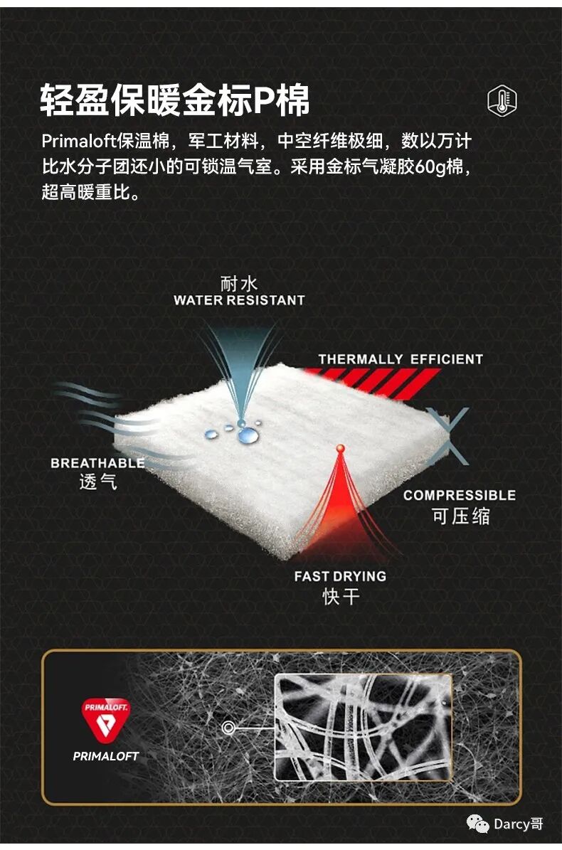 该款棉服采用Primaloft保温棉,军工材料,中空纤维极细,数以万计比水分子团还小的可锁温气室。采用金标气凝胶60g棉,超高暖重比。