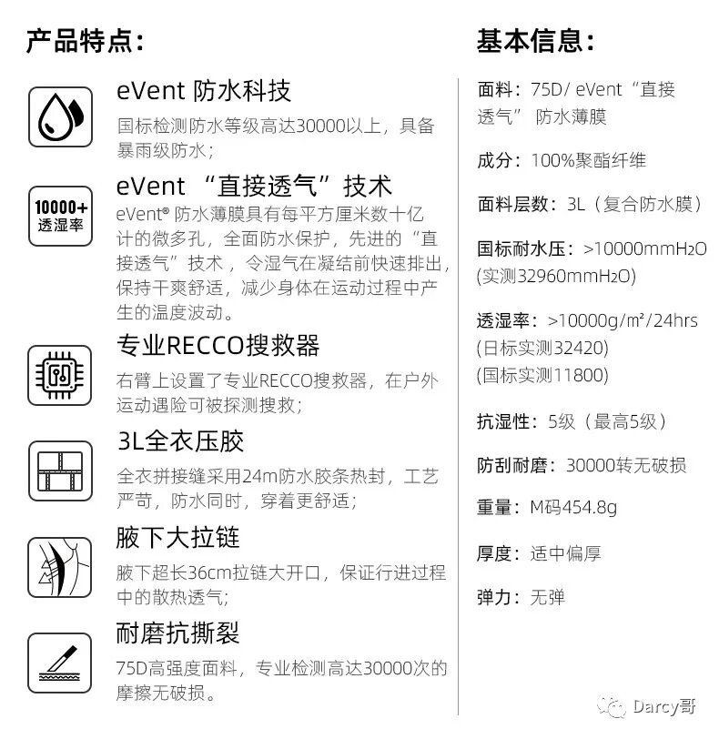 采用eVent蓝标防水科技面料。waterproof为event 的高端“蓝标”系列全面防水,高度透气。
