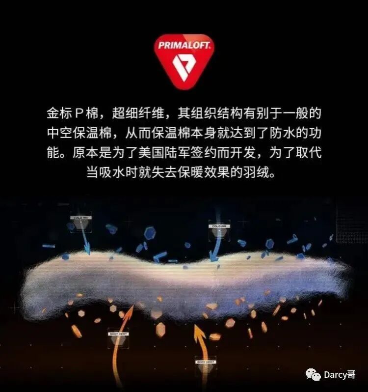 我们经常能看到PrimaLoft的标志,它就是P棉。P棉是一种模仿羽绒结构的人造纤维保温材料,也叫中空保温棉。