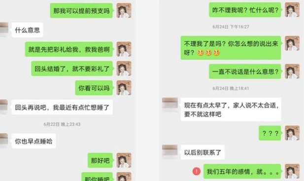 可是事情没有发生在自己身上,谁也无法理解当事人的痛苦。设身处地的想,如果曾经满心呵护疼爱的自己的亲人,垂垂老矣,卧病在床时,谁会狠心抛下他们,而不去为他们争取那一线生的可能。梁某也学别人在网上筹款,但是效果甚微,筹到的钱也是杯水车薪,最后万般无奈之下,她把目光瞥向了与自己已经相恋5年的男友。于是就又有了开头的那一幕,本以为相爱5年的深厚感情,男友会拉她一把,不成想,不仅没有拿到钱,连感情都自此划上了句号。在梁某爆出的聊天记录中,她这样询问男友:“可以预支彩礼吗?我想救我爸”、“回头结婚了,就不要彩礼了”。