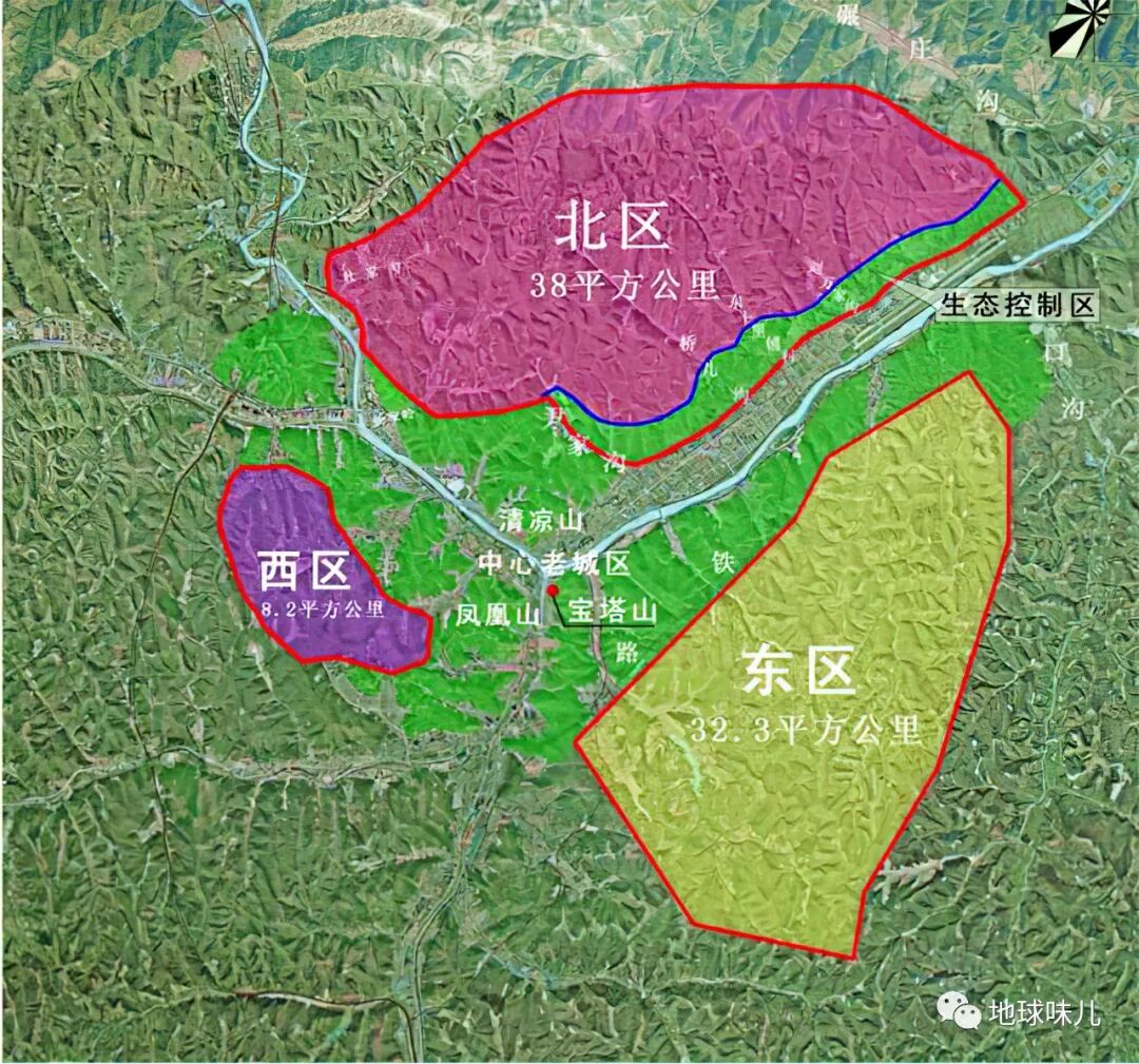 初步拟定延安新区范围为78.5平方公里,能够承载40万人口,划分为三个片区,分别是北区、西区和东区,北区主要分布市行政中心,商务中心和居住区,西区是区级行政中心,红色文化体验区,东区主要发展旅游业。