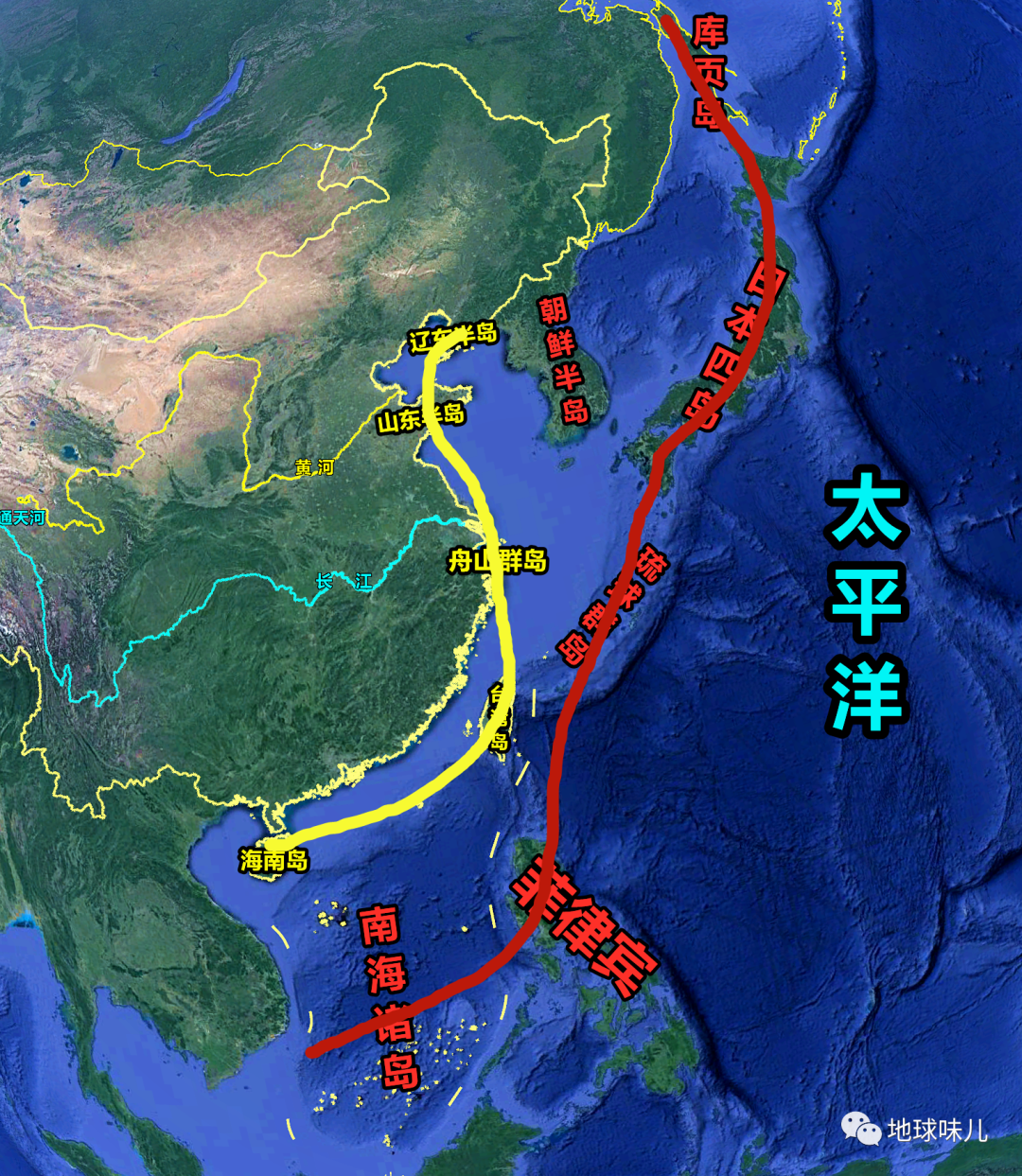 我国东南沿海同样是内外两圈护卫,外圈为朝鲜半岛、琉球、南沙群岛诸岛礁,强大时甚至也可以将日本四岛、库页岛、菲律宾群岛等当成外圈,内圈则为我国辽东、山东两半岛,中部的舟山群岛以及台湾、海南两海岛,通过这两个防卫圈,我国进可以辐射整个太平洋,退可以依托沿海岛链层层设防,自由度非常高。
