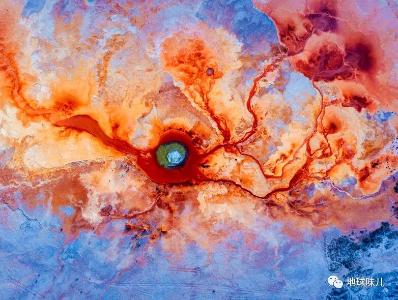 又如有“恶魔之眼”之称的艾肯泉,距离茫崖翡翠湖不远,本体是一处地热喷泉,直径约有10米,泉水源源不断地喷涌了千百年。被泉水从地底带到地上的硫磺矿物质,在艾肯泉周围持续堆积,形成了椭圆形的红褐色环带,从高空看去,正如大地之眼凝视天空,摄人魂魄。