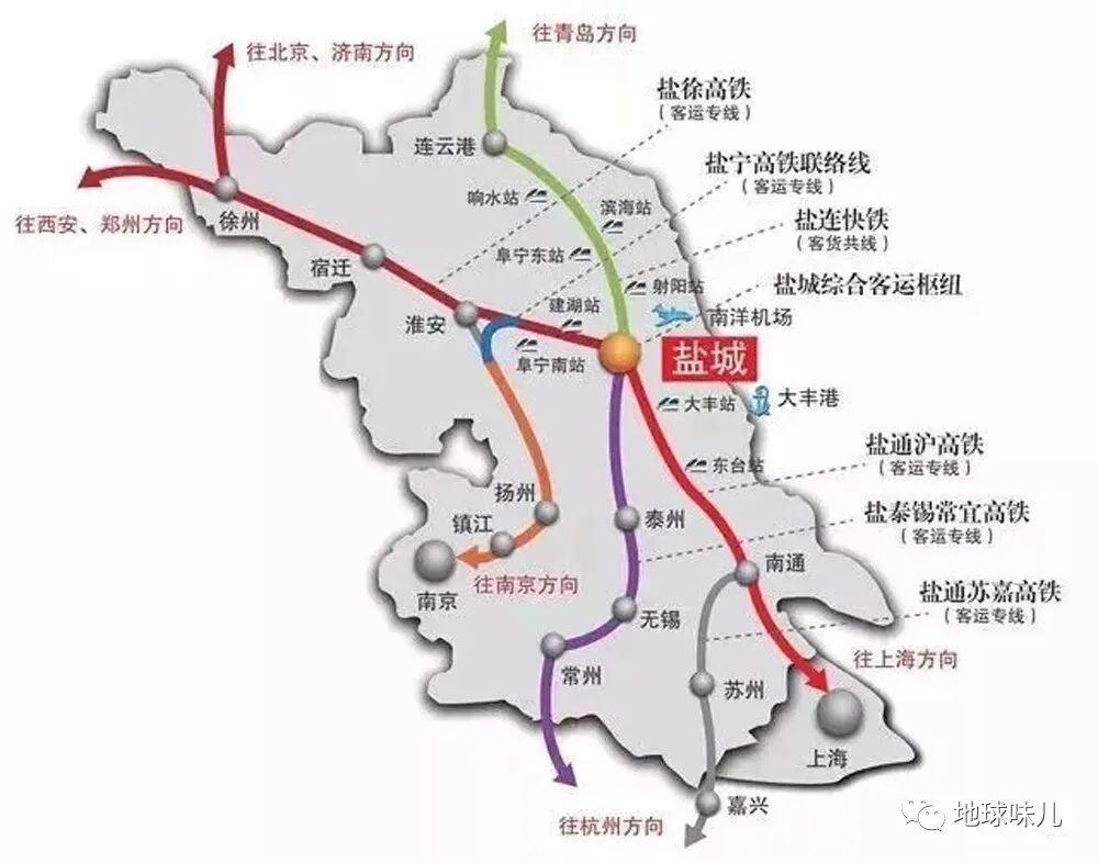 盐城地盘虽大,但相对位置还是太偏,远离江苏的传统中心轴徐州—淮安—扬州—南京一线,长期以来一直没有通铁路,直到2005年新长铁路通车,盐场才拥有了第一条铁路,不过,盐城的铁路发展很快,2018年,连盐铁路通车,2019年,徐盐铁路通车,2020年,盐通铁路通车,2022年,宁盐铁路通车,仅仅十几年的时间,盐城完成了从铁路线到铁路网的跨越。