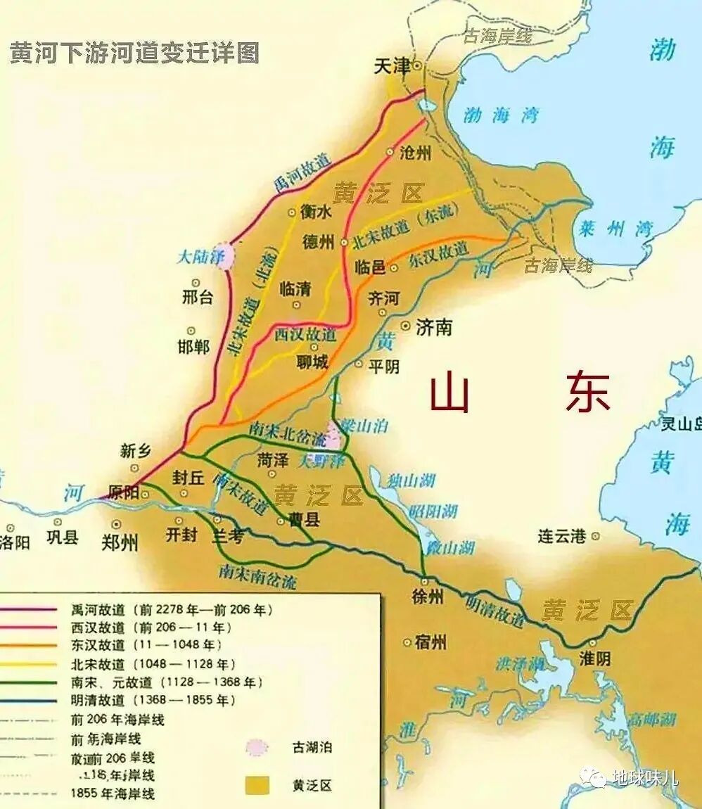 其中,这片黄泛区今天又可以以黄河下游河道为界,分为南北两部分,以北是河北大平原,以南是豫东、鲁西南、皖苏北部平原,南北两部分虽说历史上都曾遭受过黄河的反复蹂躏,但从更长的时间尺度上来看,其实黄河以北的河北平原才是黄河的老家。