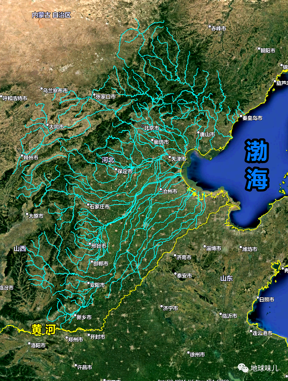 上面是一张海河流域的河流地图,可见,万千河流都入了渤海湾。