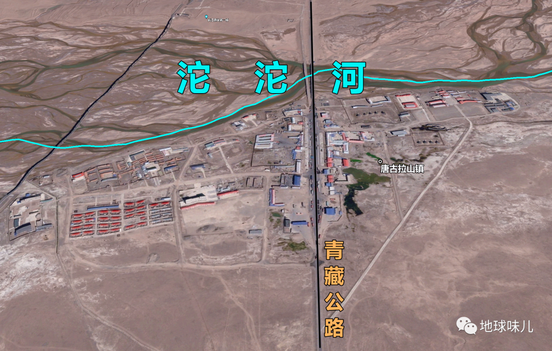 从地图上看,唐古拉山镇位于沱沱河的南岸,青藏公路从镇子的中心穿过,镇上的建筑非常稀疏,可以看出人口的稀少,镇子中央停了很多货车,是重要的公路中转站。
