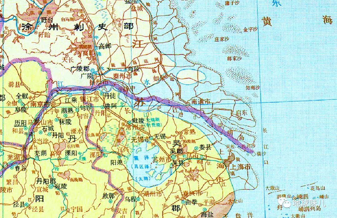 上面是一张东汉时期的长江口附近的地图,可见,当时的长江口位于扬州附近,也就是说,从扬州出来就直通大海了,而那时的扬中岛还没有影子呢。