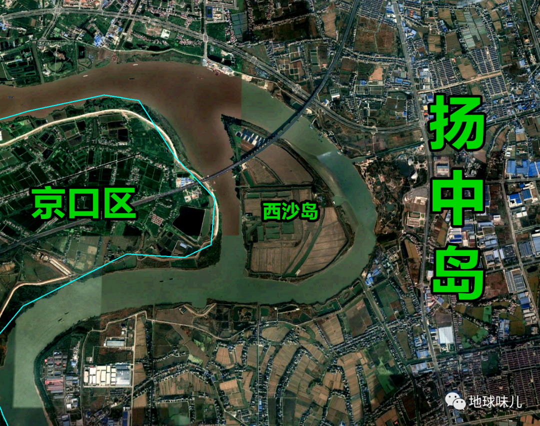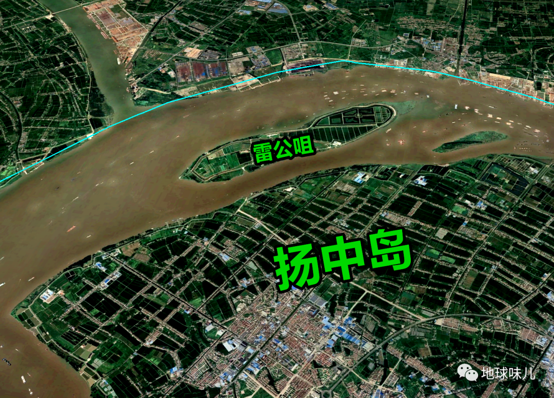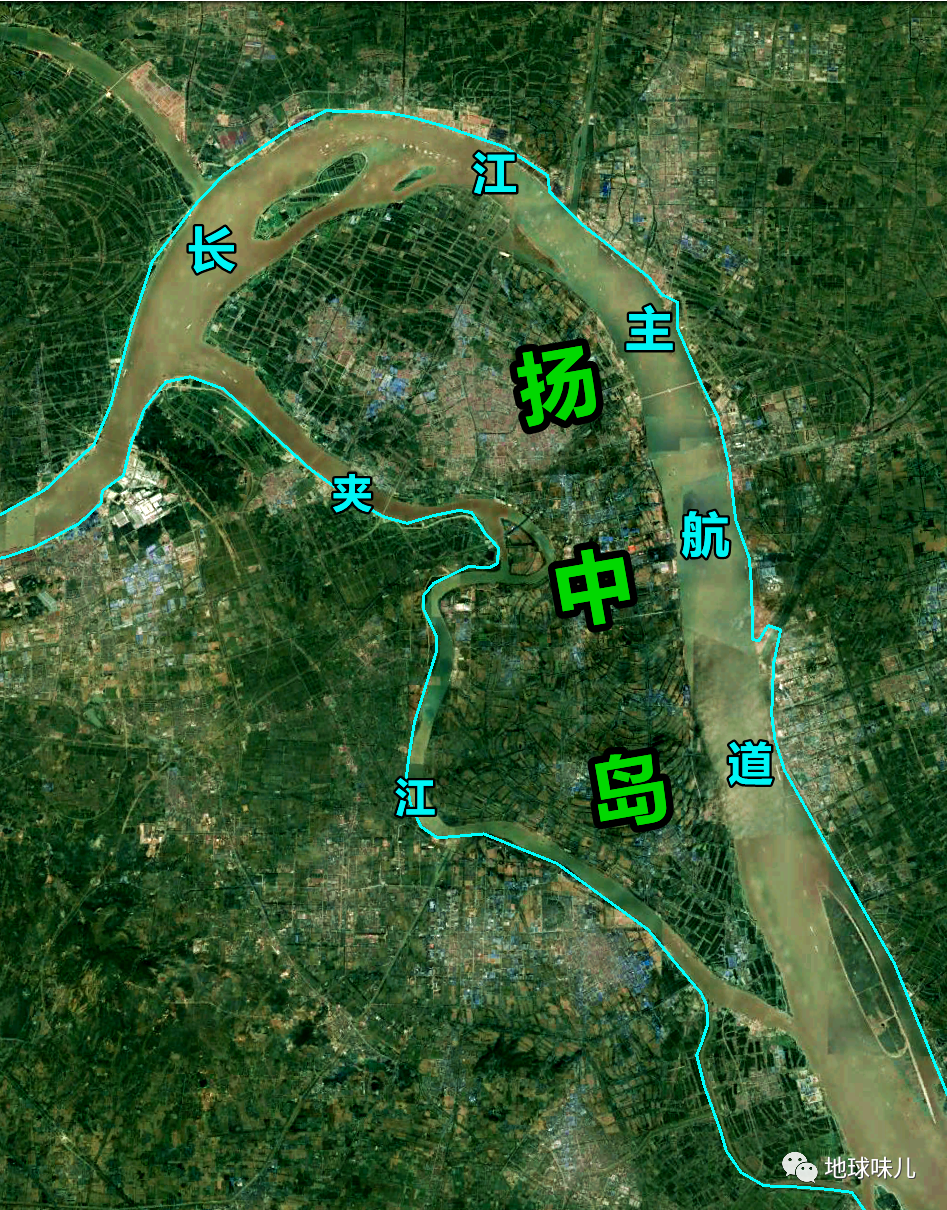 从外形上看,整个扬中岛呈卧蚕状趴在江水中,它的北面是长江主航道,南面是稍窄一些的夹江,长江本来是东流的,绕过扬中岛之后突然急转直下往南流去,来了个90度的大转弯,之后又折往东流去。