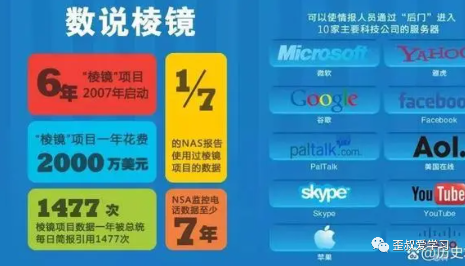 根据2013年6月3日《卫报》的披露,按加入时间来排序,以下科技公司和部门参与到棱镜计划: