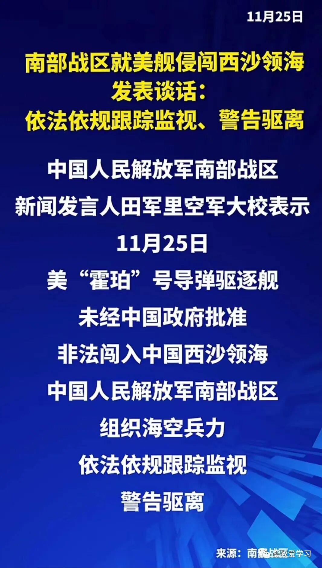 11月25日,美国“霍珀”号导弹驱逐舰未经中国政府批准,进入南海西沙群岛领海,引发了地区紧张局势的升级。