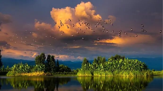 夏季的邛海更是美不胜收,那时牧场上到处开满了金色的玛纳斯,一望无际的高原花海随风摇曳。湖边的芦苇丛里也开满了黄色的鸢尾花,微风过处,满湖芳菲。站在湖边远眺,碧波荡漾的清水与金黄色的花海交相辉映,宛如一幅色彩浓烈的印象派油画,美轮美奂。