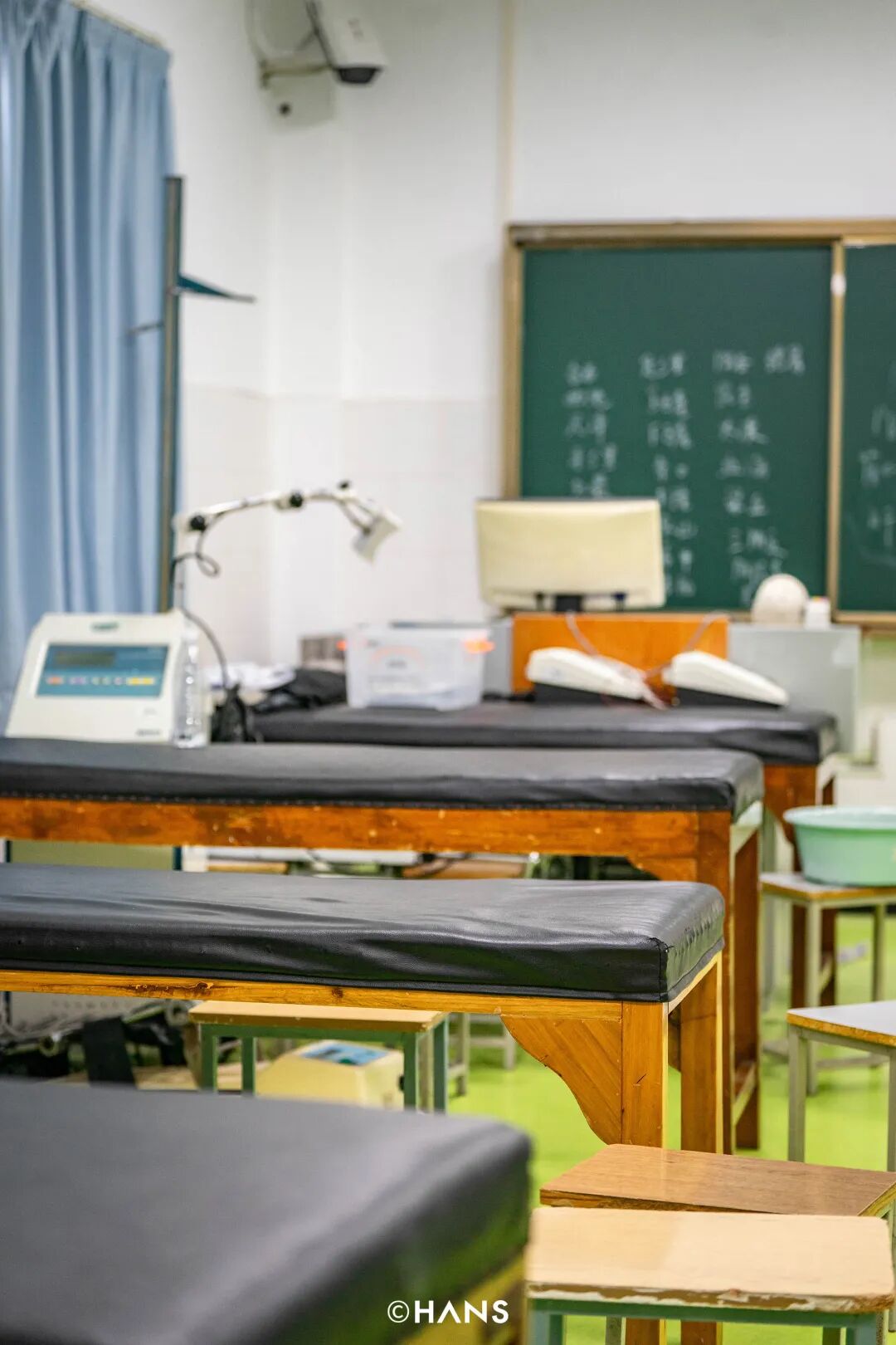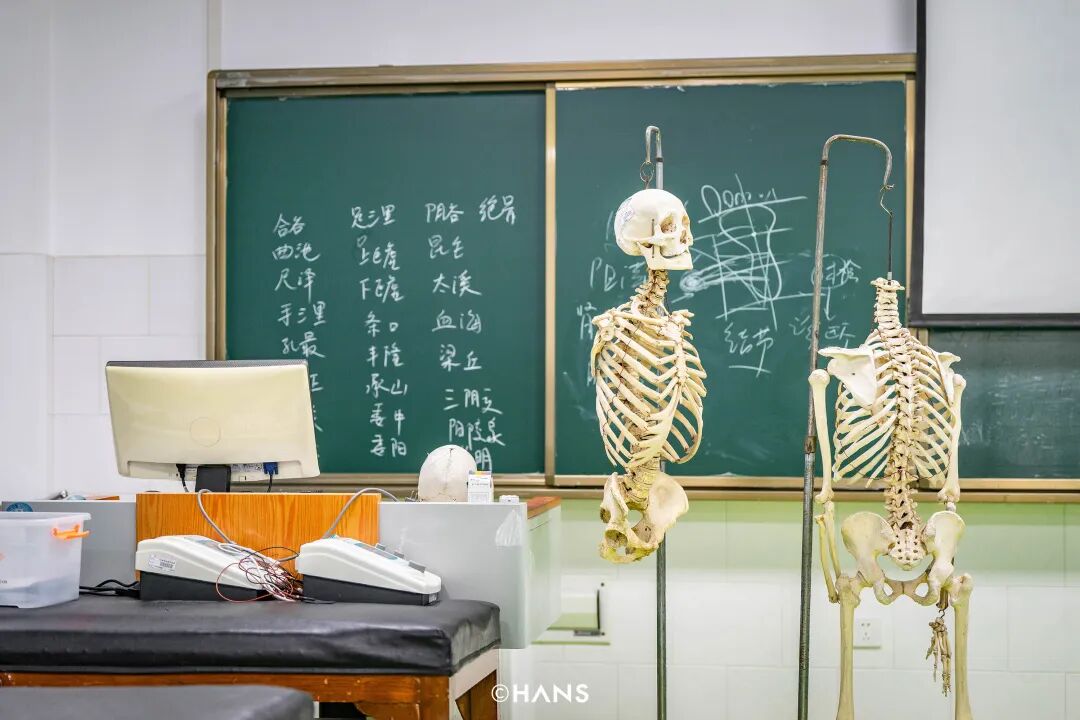 更里面一间教室,放着十张诊疗床,两具大骨架,横陈黑板前,布景联想到汉尼拔,但只是同学们学习骨骼走向和穴位的“教科书”。