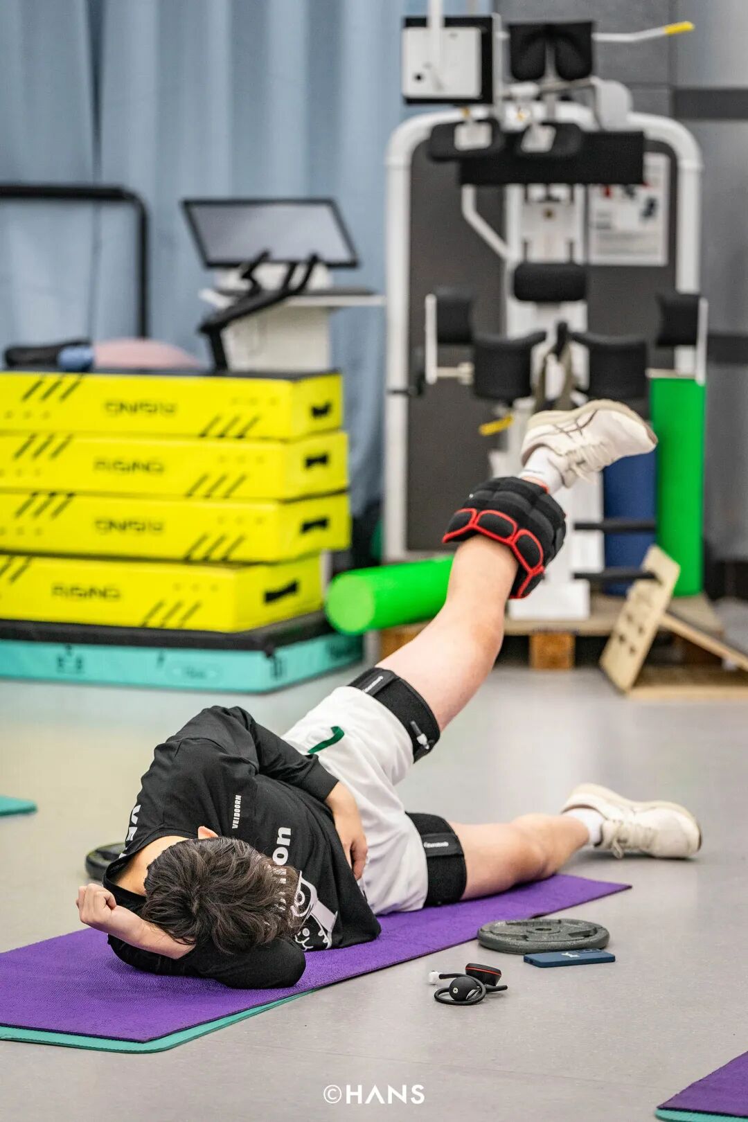 这边,一个男生五花大绑,在床上治疗腰椎。那边的同学,头裹成花苞,吊挂起来进行颈椎牵引。中间空地也没闲着,体能激活进行时,二十个波比跳,强度拉满。