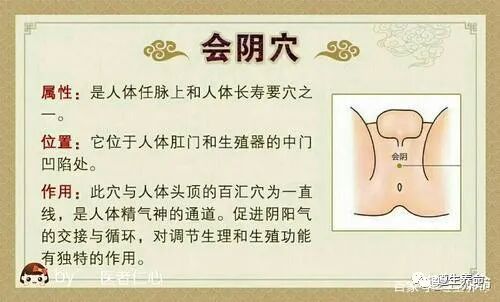 会阴穴,为人体长寿要穴。会阴,顾名思义就是阴经脉气交会之所。此穴与人体头顶的百会穴为一直线,是人体精气神的通道。百会为阳接天气,会阴为阴收地气,二者互相依存,相呼相应,统摄着真气在任督二脉上的正常运行,维持体内阴阳气血的平衡,它是人体生命活动的要害部位。