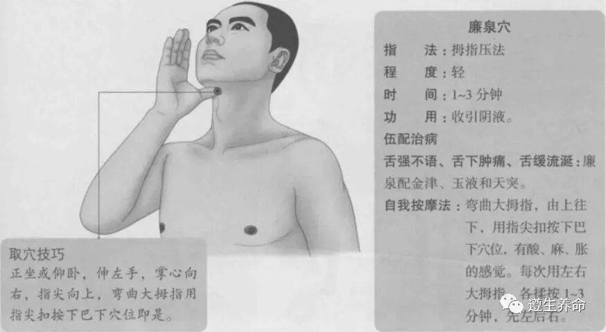 主治:言语不清,舌根急缩,舌下肿痛,舌缓流涎。廉,廉洁、收廉的意思;泉,水的意思;“廉泉”的意思是指任脉气血在此冷缩而降。本穴物质为天突穴传来的湿热水气,至本穴后散热冷缩,由天之上部降至天之下部,本穴如同天部水湿的收廉之处,所以名“廉泉”,也称“本池穴”“舌本穴”“结本穴”。“本池”指本穴为任脉水湿的收聚之地。“舌本”指本穴聚集的天部水湿为任脉气血的来源根本。因为任脉气血在此位处天之下部,天之上部的气血为空虚之状,阴维脉的气血随之而入,所以此穴也是阴维任脉的交会穴。如果因为受了风寒或者中风之后,舌头不能转动、不能说话,或者大舌头、舌肿难言;虽然想讲话,然而口水却不断流出。遇到上面这些情况,可以按压廉泉穴,就能够起到缓解症状的作用。据《甲乙经》记载,此穴位为“阴维、任脉之会”;《图翼》中云:“然则廉泉非一穴,当是舌根下之左右泉脉,而且为足少阴之会也。”