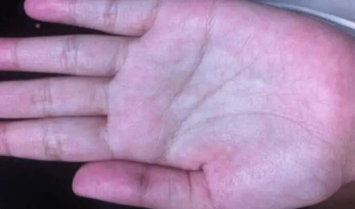 1、掌心出现一个“红点”,这是一种特殊的现象。