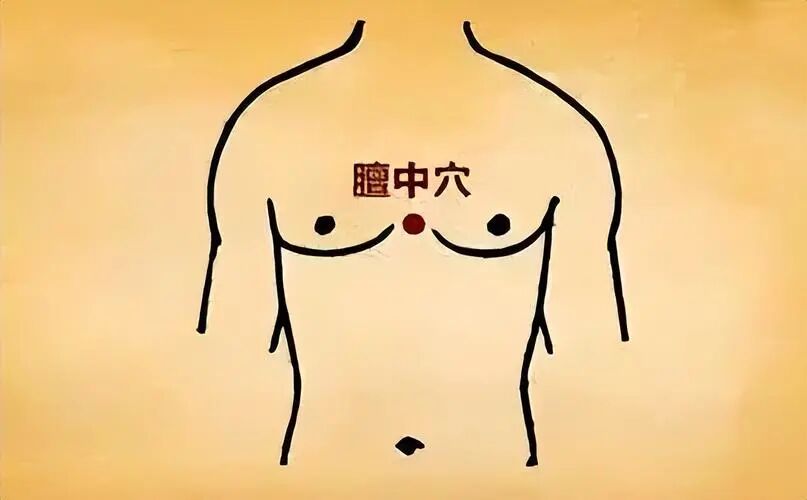 膻中穴,又称“上气海”“元儿”“胸堂”等。根据《针灸大成》一书的描述,其定位为“在两乳间,折中取之,有陷是穴,仰而取之”,即两乳头连线的中点处。“膻中”一词首见于《灵枢·根结》,即“厥阴根于大墩,结于玉英,络于膻中”。