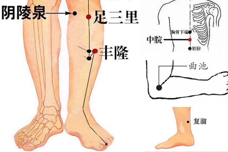 丰隆穴:外膝眼和外踝尖连线的中点。