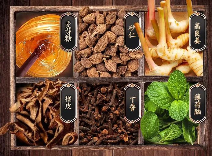 方中的砂仁和橘皮,都是天然的“祛湿健脾”材料,高良姜和丁香对消除湿寒很好的效果。