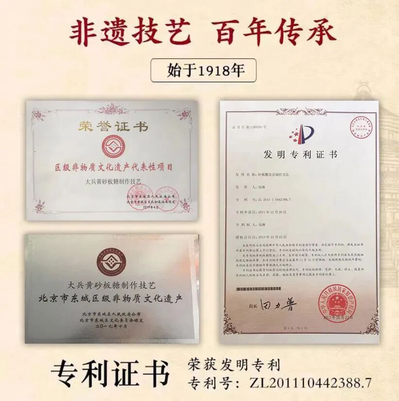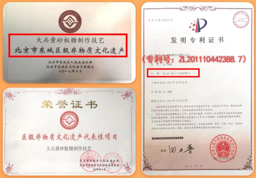 凭借其独特的技艺、出众的效果,大兵黄砂板糖现已被列入 《北京市东城区非物质文化遗产》,并荣获发明专利!