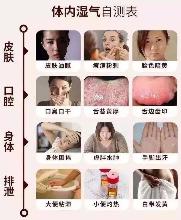 除此之外,湿气重的人还有很多症状,大家快对照下图自测一下,如果中了2条以上,那你大概率是“湿气入体”了!