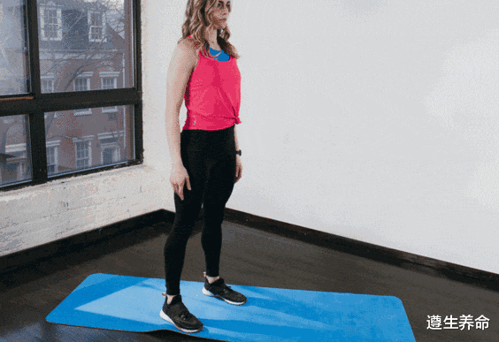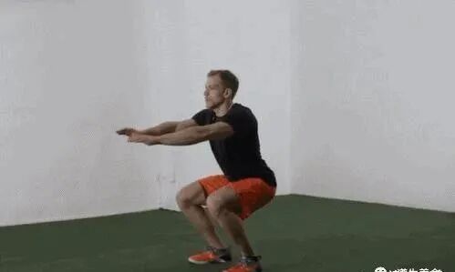 首先站立,直接在瑜伽垫上面做,抬头挺胸;双脚分开与肩同宽,双脚平行,脚尖向正前方;脚掌也可以是分开成一定的角度,约60度,但要保持下蹲时膝盖的方向与脚尖方向一致。身体慢慢往下蹲,两臂上抬高前伸与肩平行。直到大小腿的夹角小于90°,但不要贴紧放松,约70—80度即可;然后大腿前面用力站起来,直到站直,两臂下垂于身体两侧。