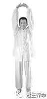 2.躯干直立,下肢微屈。双上肢内旋,双掌稍微有向下按的感觉,随着吸气,两腿用力将身体向上托起来,双上肢外展外旋,尽量吸到无法继续吸气